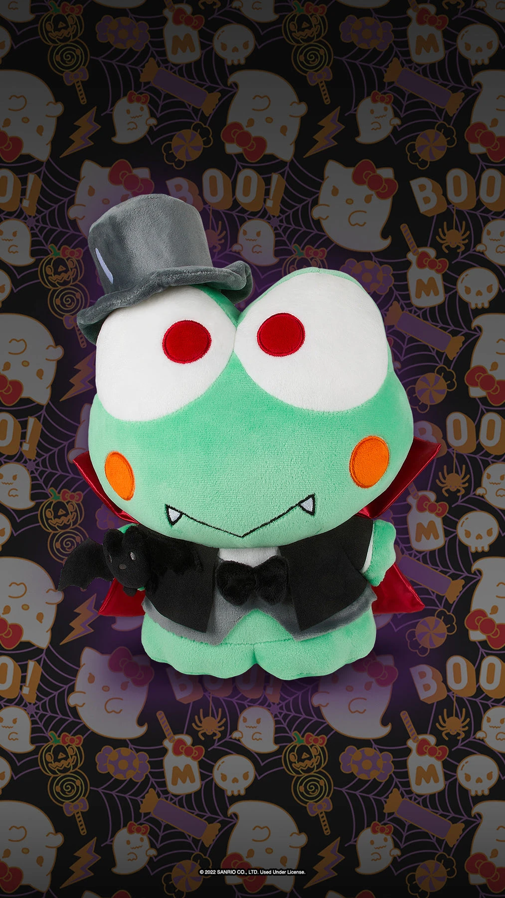 their Halloween costumes for an eerie-sistibly fun time! Each plush friend is dressed as a different spooky character. Keroppi is dressed as Dracula and looking fang-tastic! The Hello Kitty Keroppi Dracula Plush measures 13” tall and is made of the softest premium materials.