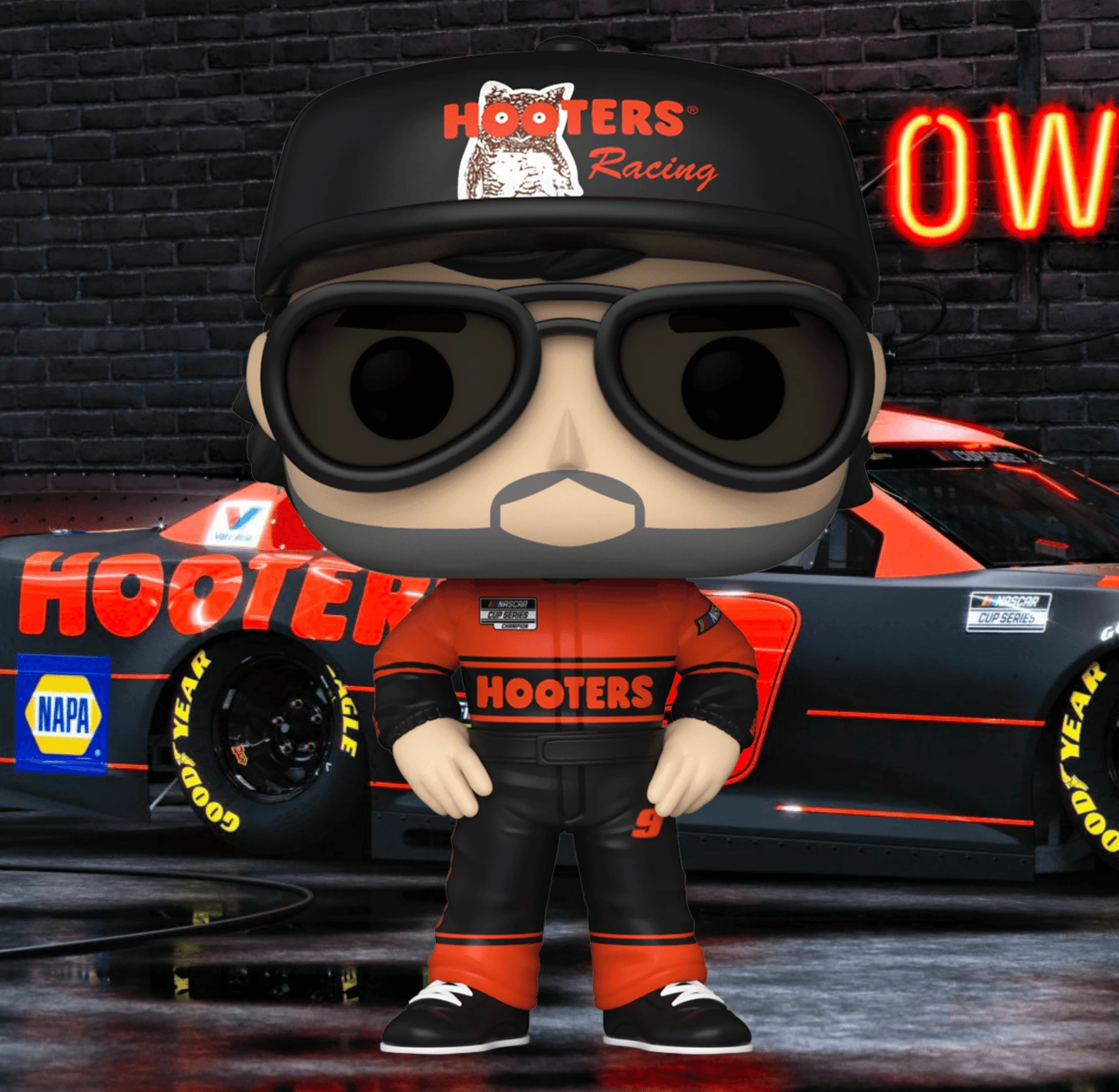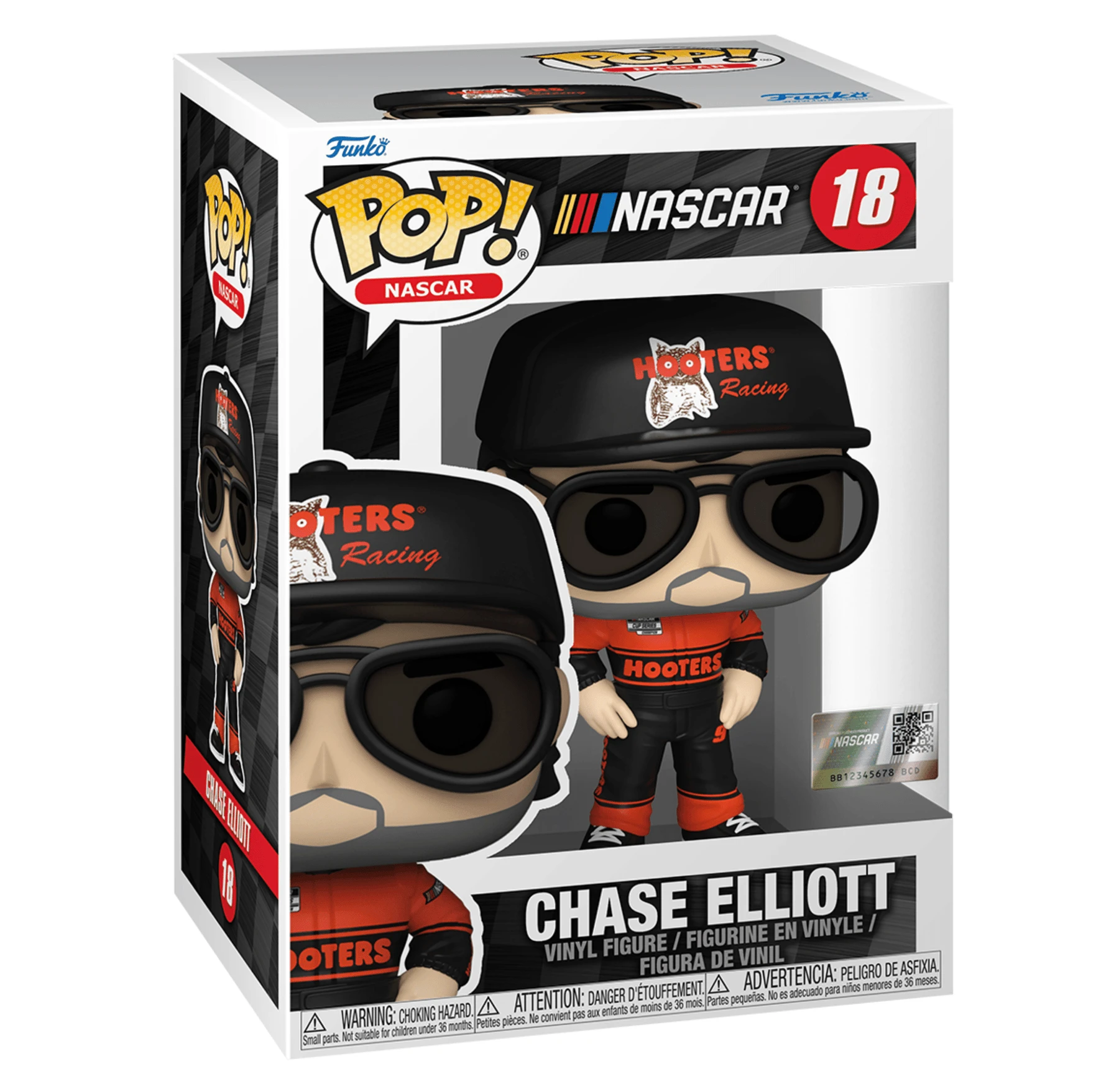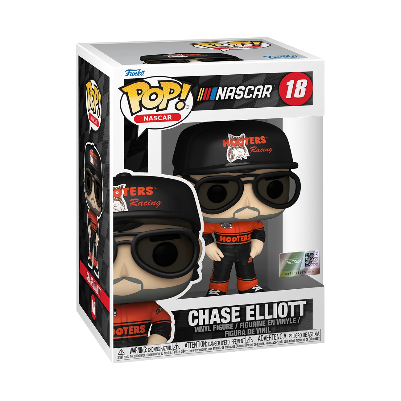 Race to the finish line! Pop! Chase Elliot, in his Hooters racing uniform and matching baseball cap, will take first place in your NASCAR collection. Vinyl figure is approximately 4-inches tall.